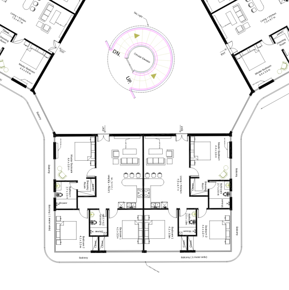 The design concept integrates functionality with modern Mediterranean aesthetics. Every decision — from core placement to balcony orientation — optimizes energy, light, and living comfort. The overall plan reflects efficiency without compromise, providing lasting value for both residents and investors.